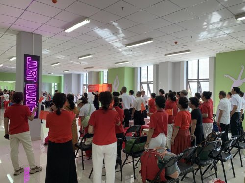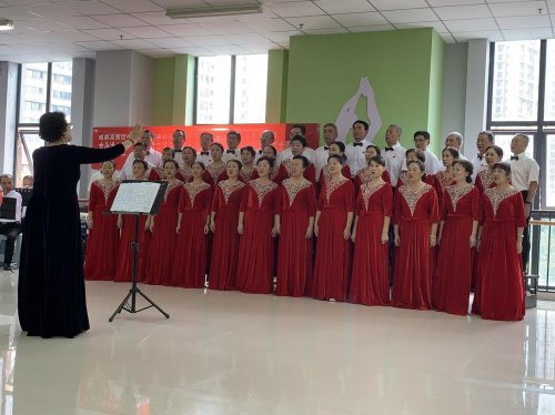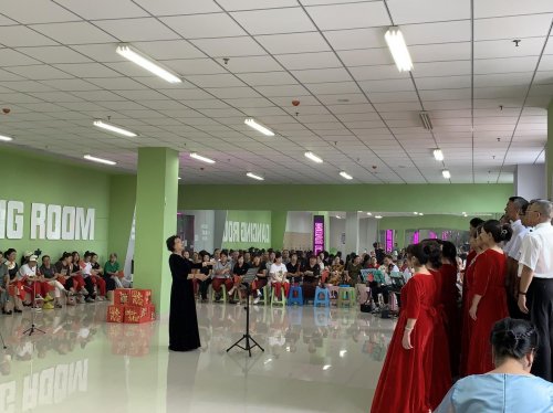 台下居民也全程投入,有人挥舞着手中的小国旗,跟着节奏轻轻拍手;有人拿出手机记录精彩瞬间,不时为台上的表演者鼓掌喝彩;邻里间还相互交流着歌曲背后的故事,分享着对国庆假期的期待,原本互不熟悉的居民,在歌声与欢笑中渐渐拉近了距离。活动尾声,全场100余人共同起立,齐声高唱《我爱你,中国》,嘹亮的歌声回荡在舞蹈室内,将现场氛围推向高潮,爱国之情在每个人心中激荡。