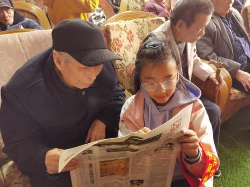 节目表演结束后,温馨的读报交流环节随之展开。小志愿者们每人结对1-2位老人,手持报纸,用清晰温和的语气为老人朗读时政新闻、健康常识等内容。遇到老人感兴趣的话题,孩子们便停下脚步,耐心倾听老人分享过去的生活经历。“爷爷,您年轻时的工作真了不起!”来自四川大学附属小学三年级的何安然听完刘爷爷的故事后,由衷地赞叹道。