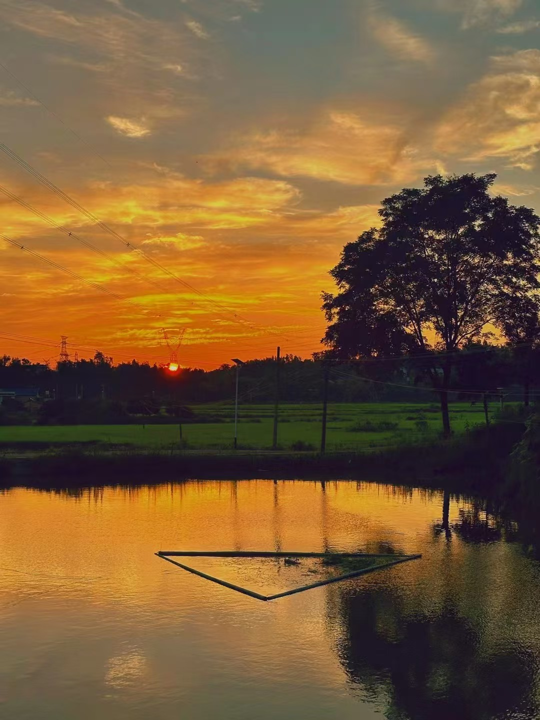 晚霞满天,斜阳洒满金黄的稻田。一片火烧云占据了西边的天际。白的不是云、红的不是血、黄的不是金,而是来自宇宙的光芒。人们回到家中!安静平和、丰衣足食、风调雨顺,恰到好处的生活。真好!